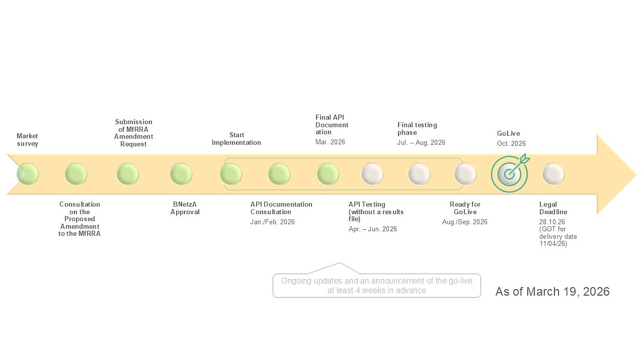 The Federal Network Agency (BNetzA) approved the amendment on October 28, 2025, under reference BK6-25-212. This sets a regulatory implementation deadline of October 28, 2026, at the latest. This date therefore marks the day from which 15-minute slots must be submitted and corresponds to the gate open time for the delivery date of November 4, 2026, with the gate closure time on November 3, 2026. The TSOs will keep the balancing service providers continuously informed about the planning and implementation status and will announce the exact date of go-live at least four weeks in advance via a publication on the TSOs’ joint website, regelleistung.net. The system will not go live before October 2026.